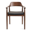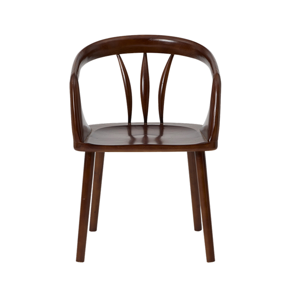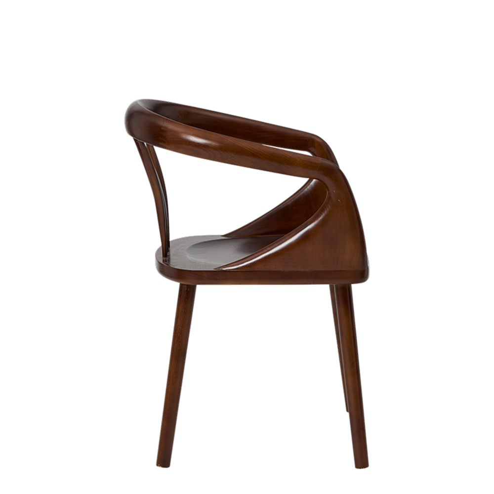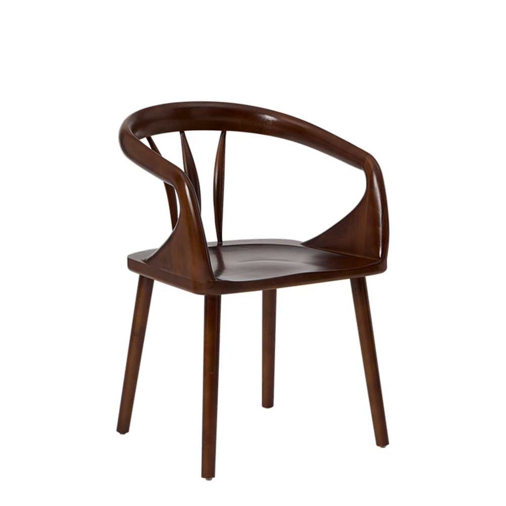 Restaurant Furniture Curved Backrest Armrest Dining Chair is crafted with sleek, rounded edges for a modern yet timeless look. This sturdy, well-built chair offers both style and durability, making it a versatile choice for any event. Its minimalist design, free from a seatpad, allows the natural beauty of the dark wood to shine through while providing long-lasting comfort and support.
