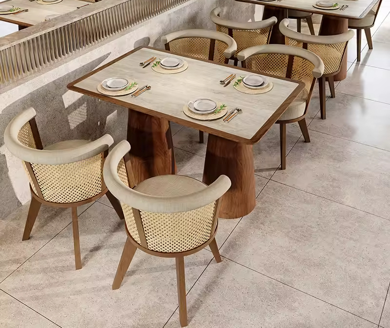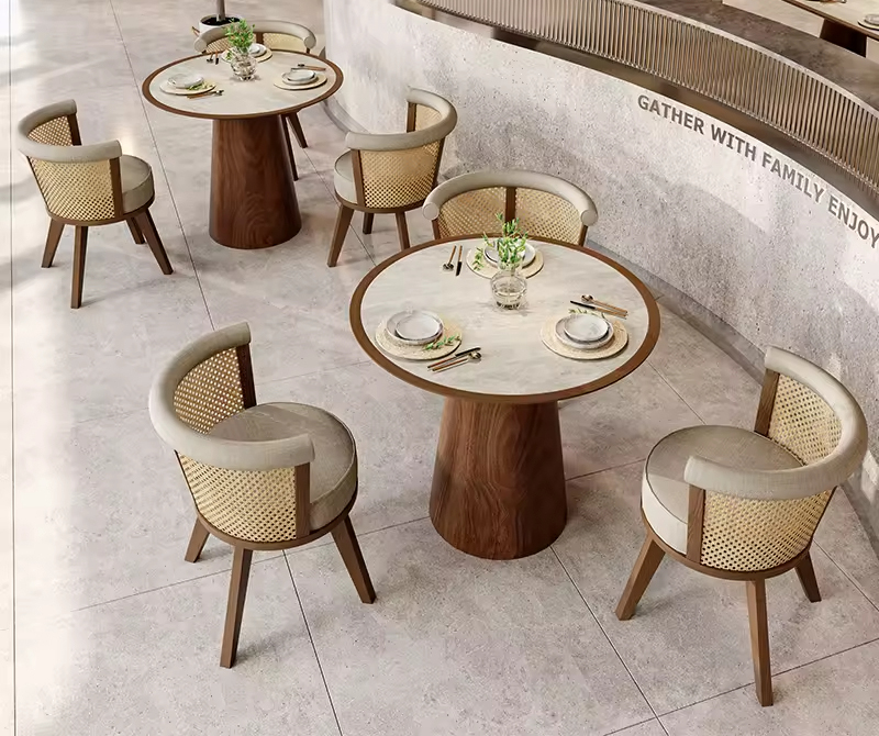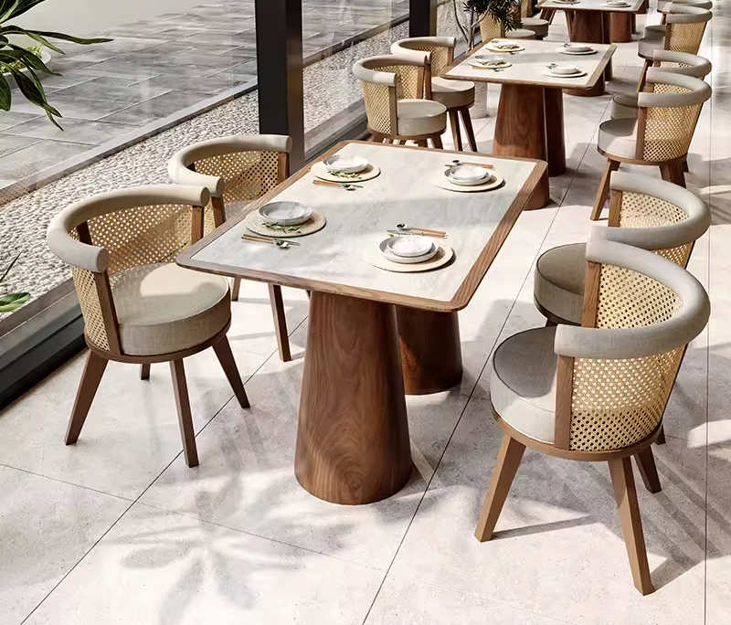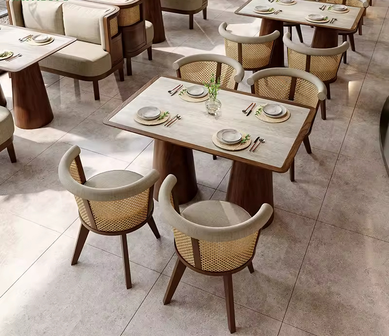 Upgrade your dining space with our Custom Wholesale Commercial Modern Restaurant Set Rattan Solid Wood Dining Chairs. Designed for durability and style, these chairs blend contemporary aesthetics with timeless solid wood craftsmanship. The rattan accents add a natural, inviting touch, making them perfect for high-end restaurants, cafés, and commercial spaces. Whether you’re looking to furnish a small boutique or a large dining establishment, these chairs offer both comfort and elegance in every detail.