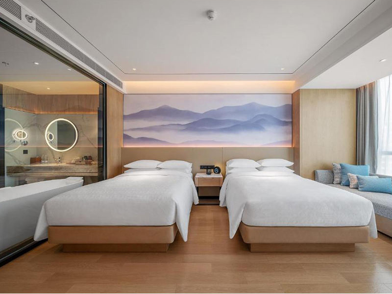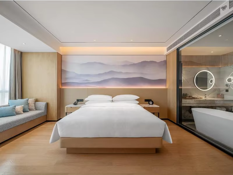 The warm wood finishes, ambient LED backlighting, and custom wall panel design create a calm and inviting atmosphere, while the seamless connection to the bathroom space enhances functionality and spatial flow. Every detail—from material selection to craftsmanship—is carefully executed to meet the standards of 4-star and 5-star hotels.