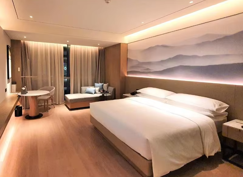 Elevate modern hospitality spaces with this minimalist luxury hotel bedroom furniture set, designed for both comfort and visual impact. Featuring a clean-lined platform bed, integrated bedside tables, and a soft upholstered seating area, this set reflects contemporary elegance tailored for high-end hotel projects.