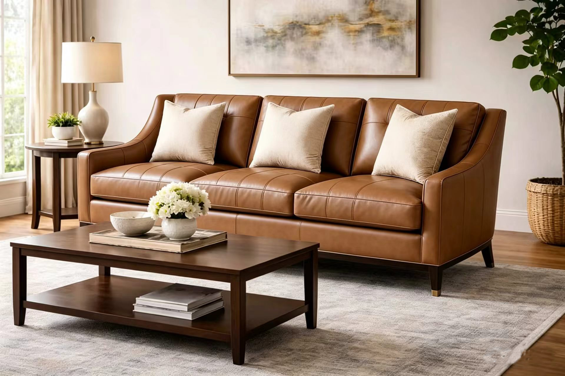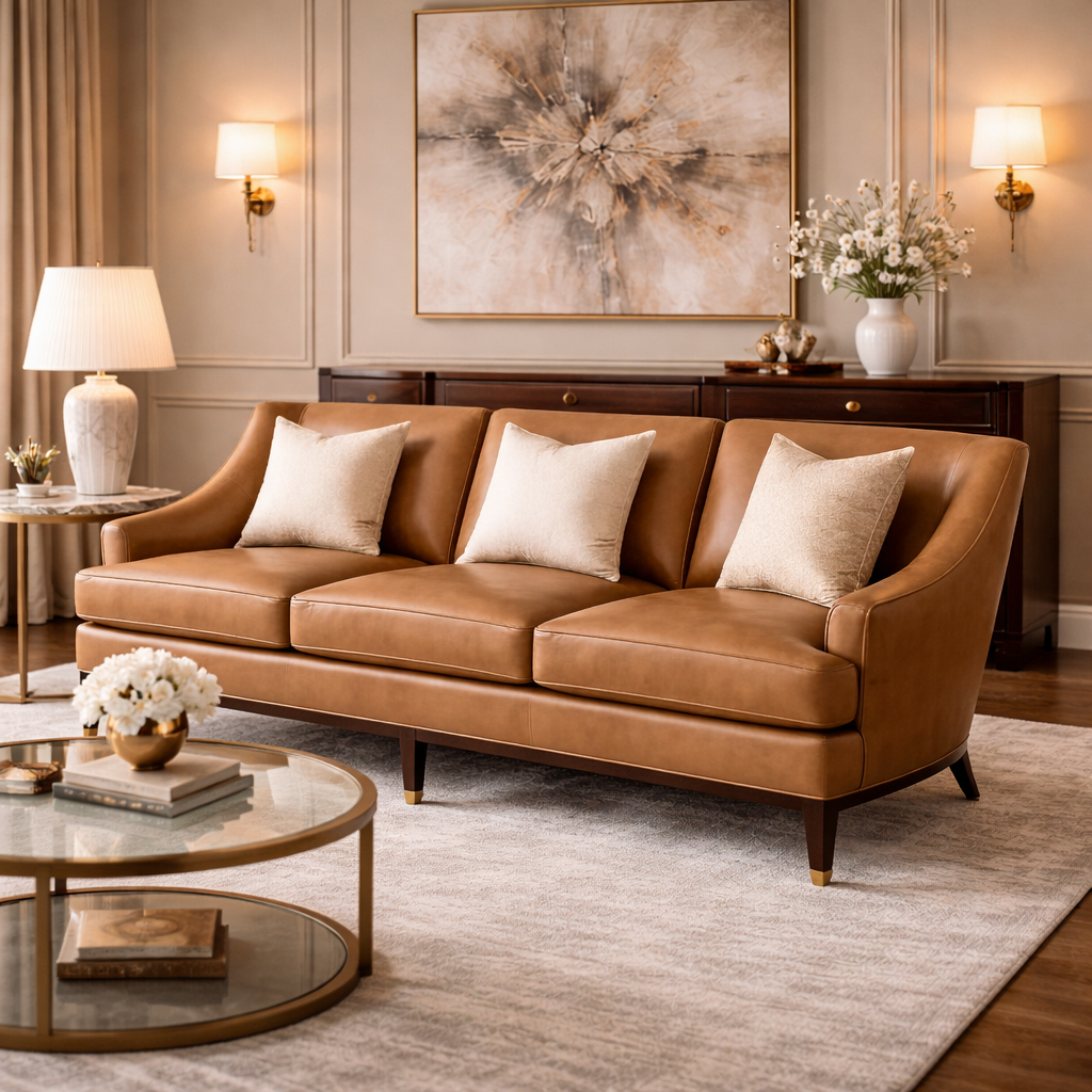 Our Hotel Luxury Modern American Vintage Classic Chic Leather Sofa has a more metro modern feel. The bottom of the sofa is solid wood and can be customized in several finishes to compliment the leather you choose. The sleek arms, plush cushions, and tall legs will add charm and exclusive comfort to your home. Shop the Hotel Luxury Modern American Vintage Classic Chic Leather Sofa group and add the perfect centerpiece to your room.