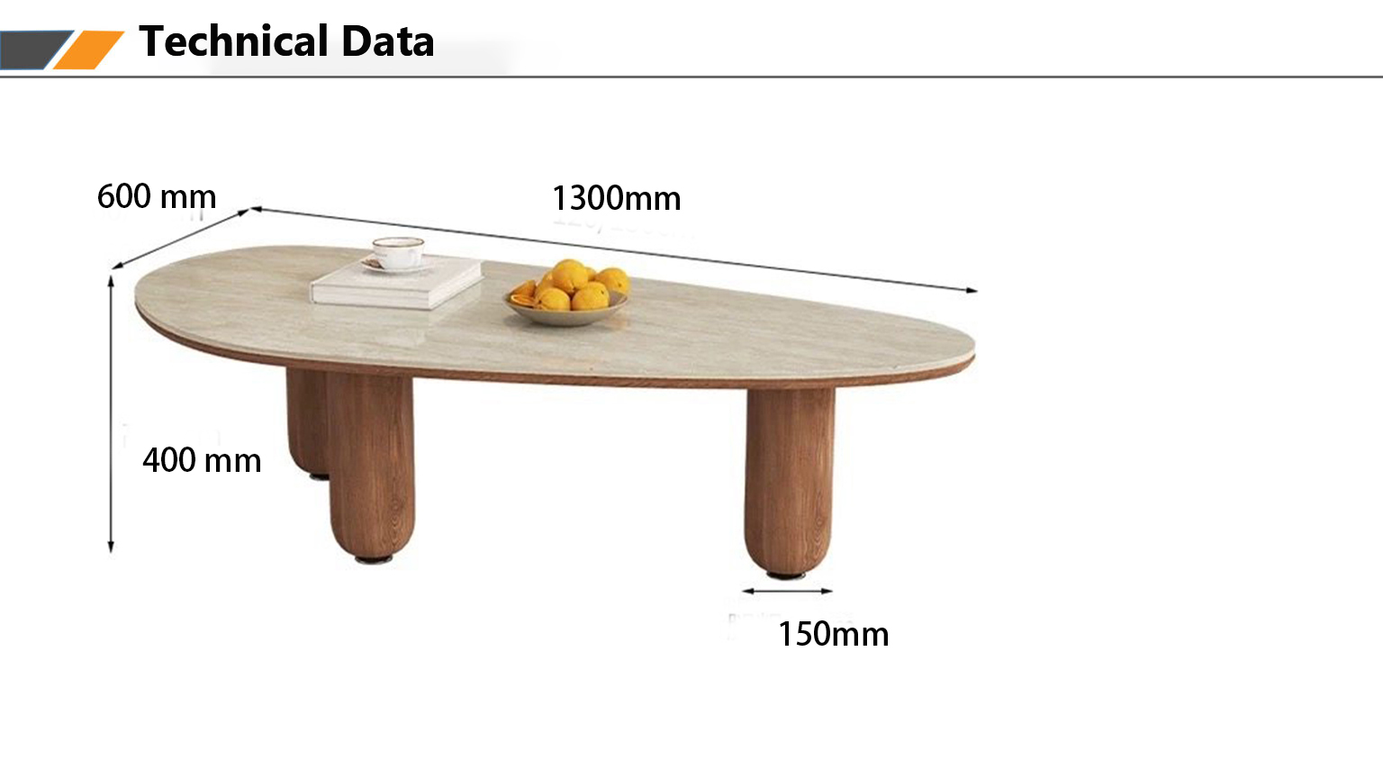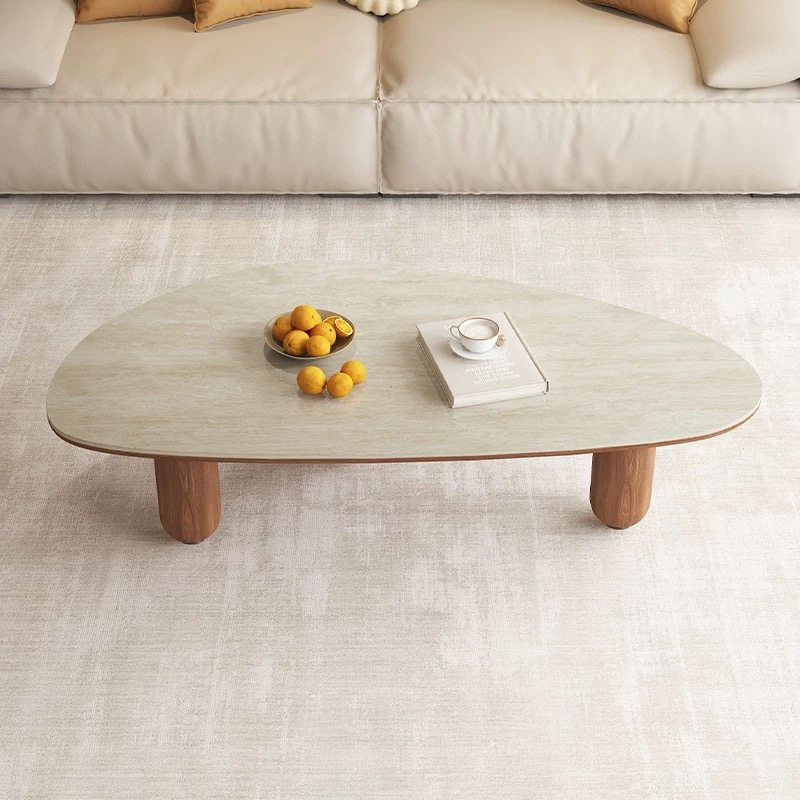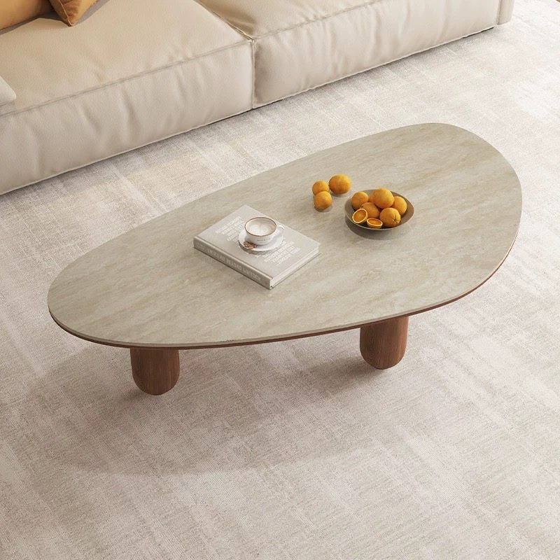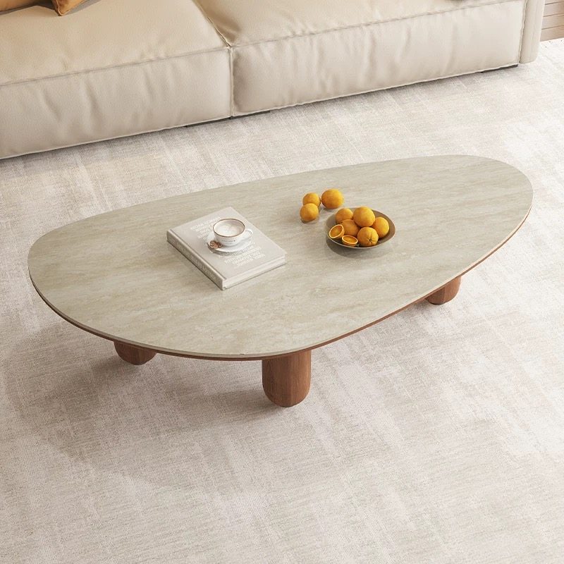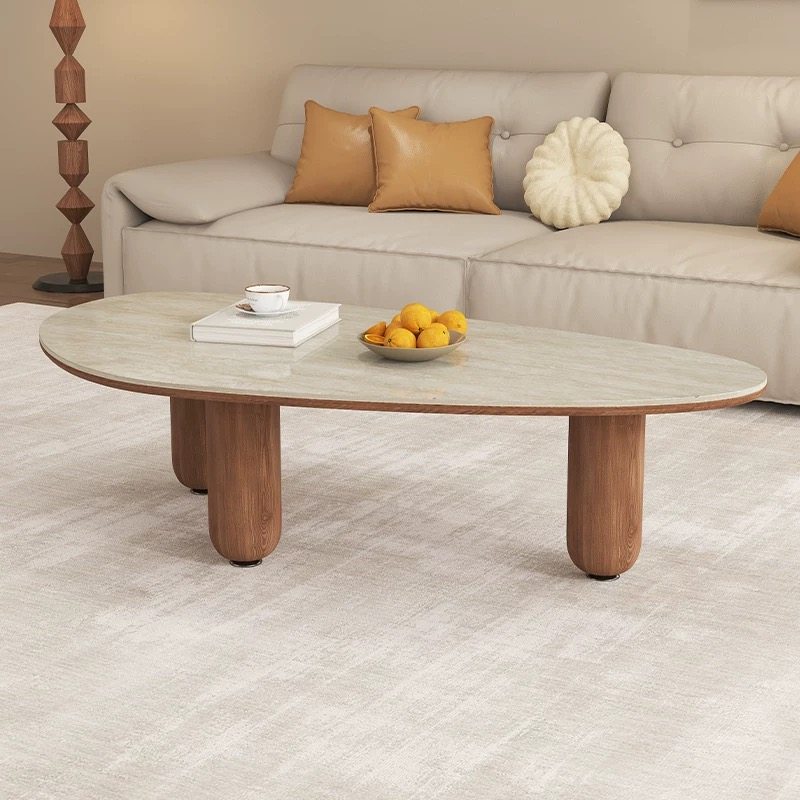 This item is a modern oval coffee table with a natural travertine top and chunky wooden legs. It features a unique, free-form or «pebble» shaped tabletop and thick, cylindrical, or columnar wooden legs.
